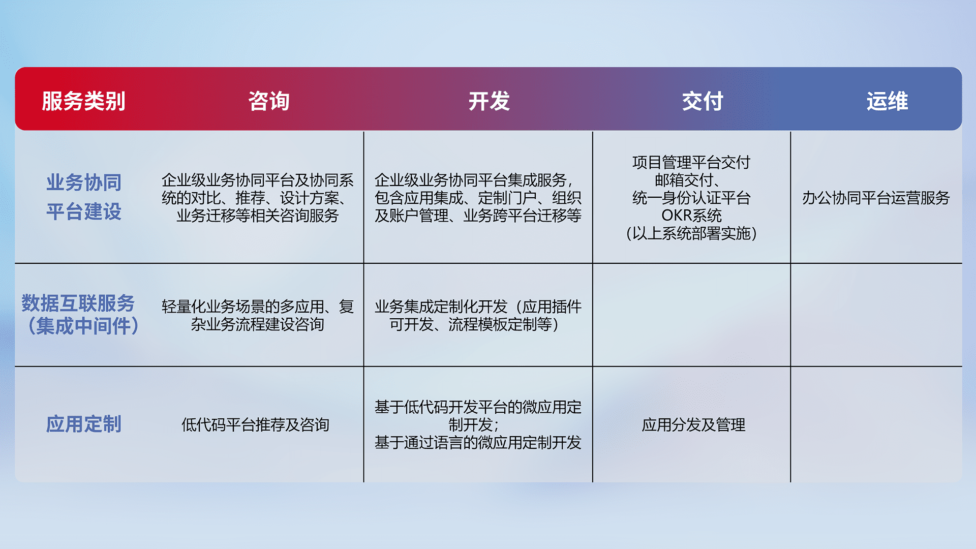针对钉钉、、、企微、、、IDaas等平台级产品提供产品的规划、、、方案、、、交付、、、定制化开发等服务,,,实现如统一协同办公、、、、智能客户服务、、混合会议管理、、智能数据查询、、、等业务场景,,实现数字化转型。。